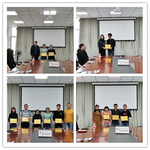 随后,进行“双室文化节”各个系列活动的统计结果公布和颁奖环节。在系列活动一——最具创意名称评选活动中,光学信息处理课题组的创意名称“绿色小屋”以97票夺得第一名;在系列活动二——人气文艺作品评选中,先进光子学实验室以364票获得第一名,新能源材料物理与技术实验室以285票获得第二名;此外,在系列活动二中其他课题组也表现积极,荣获积极参与奖,分别有:新能源材料物理与技术实验室、非线性物理研究室、等离子体实验室、生物光子技术研究室、光学信息处理课题组、激光光谱实验室、超快时间分辨光谱实验室、非线性光子学实验室、辐射与材料研究中心等。