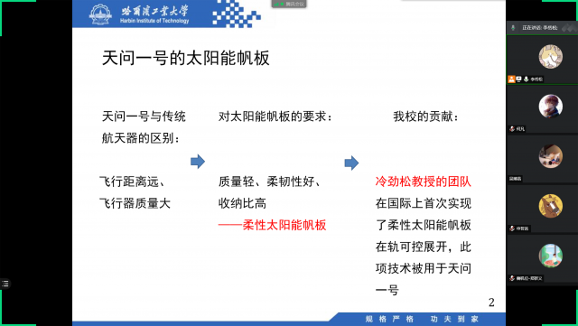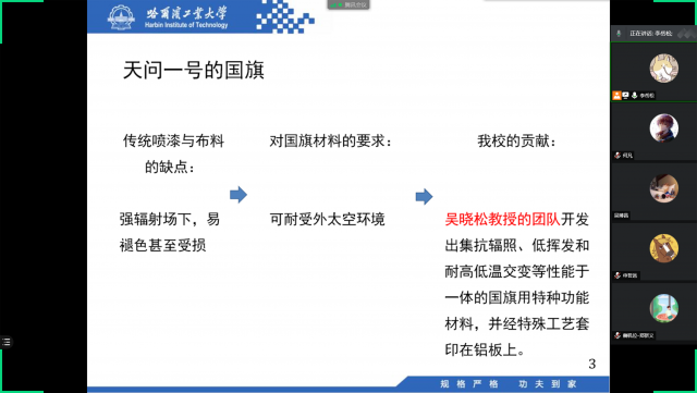 1月20日至2月1日,由组长董博文分配任务,两位队员通过网上查找资料、询问同学的方式进行调研。询问对象中,天文协会的一位同学为团队成员热心科普了火星探测器的相关知识,并详细介绍了我校在探测器太阳能帆板上的贡献。资料收集完毕后,两位队员进行组内交流、汇总。经过调研,同学们得知由我校师生所开发的可展开柔性太阳能电池系统、发动机金属橡胶阻尼环与可耐受极端条件的国旗材料等技术成果均被用于天问一号。我校团队也在“嫦娥五号”任务的月面采样技术中做出了贡献。嫦娥五号与天问一号的成功发射,我校相关专业师生功不可没。汇总完成后,李岳松同学将调研结果制作成ppt,通过线上会议的形式分享给周围同学,让更多人了解到我校为祖国航天事业做出的贡献。