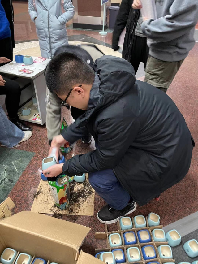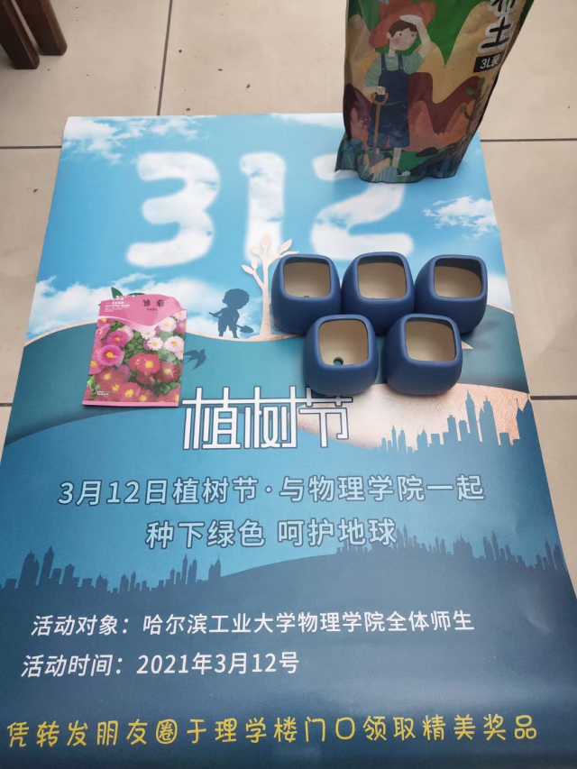 在活动前期,研究生会的成员们为大家准备了10道植树节相关测试题,并在永利集团304公众号HIT物小理发布了活动通知。参与活动的学院师生可通过扫描通知中的二维码进入测试答题页面,答对6道并转发朋友圈@一位好友即通过答卷考验,可以在植树节当天到理学楼门口领取花盆、种子及营养土。根据报名人数,活动负责人提前采购了奖品。植树节当天,通过答卷考验的老师及同学们陆陆续续在理学楼门口领取了花盆,挑选了花种子并亲手种植进去,现场的工作人员也细心的指导大家后续如何栽培,同学们都表示非常期待种子早日发芽。