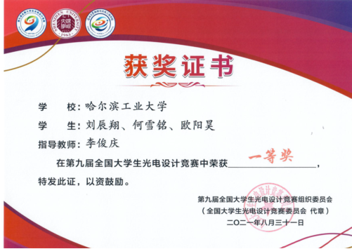 由中国光学学会主办、全国大学生光电设计竞赛委员会具体负责、深圳大学承办的“第九届全国大学生光电设计竞赛”决赛于2021年8月30-31日以线上实物赛的形式圆满落幕。永利集团304刘辰翔、欧阳昊和航天学院何雪铭同学组成的“苹光Apple”队,以基于智能手机的苹果糖度无损测量为题,获得全国决赛一等奖,指导教师李俊庆教授被评为优秀指导教师。