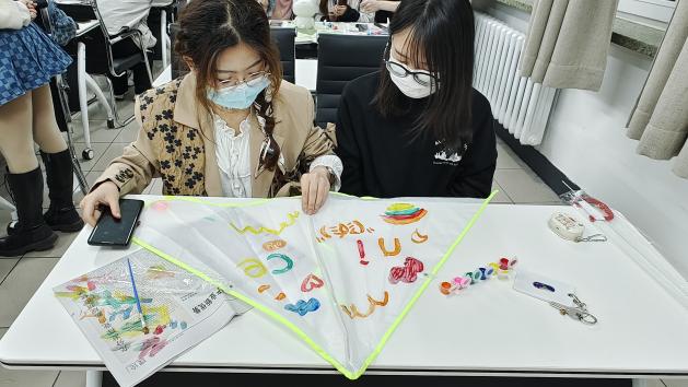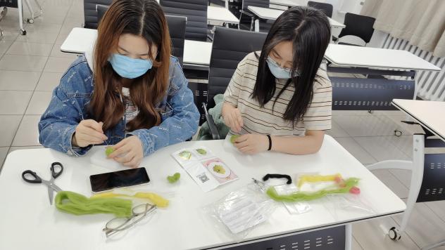 创作过程中,羊毛毡戳戳乐的同学根据教学视频互相讨论“戳”这一步骤的技术要点,实时经验分享后调整自己手中的毛毡;彩绘娃娃的同学们互相调侃娃娃的外形设计配色;风筝涂绘的同学们提前设计好了图稿,根据颜料调色绘制,相互帮助协作完成,主题鲜明。看着自己的作品随着手中的动作由大到小、由粗糙到平整、由轮廓到雏形到成型不断地变化着,同学们的焦躁情绪逐步缓解、内心也趋于平静,最后展示作品交流分享环节中,同学们互相赞美,提升了内心的满足感和幸福感。