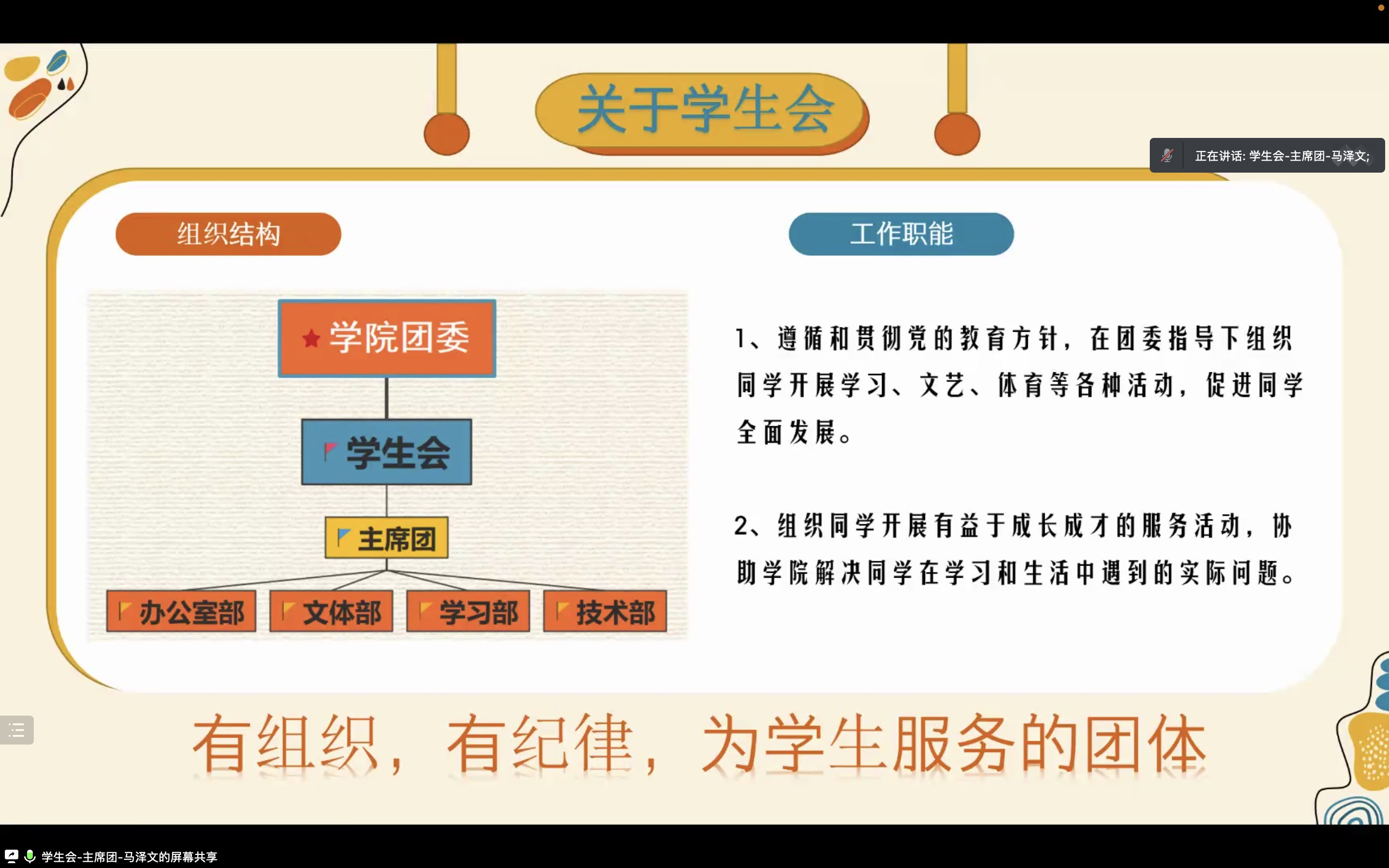 首先,杨承熹老师给同学们介绍了团学组织的基本构成,并说明了参与团学组织的基本流程与要求。接下来,各部门负责人图文并茂的依次介绍了自己部门的工作职责、工作经历及荣誉,以及部门招新要求。