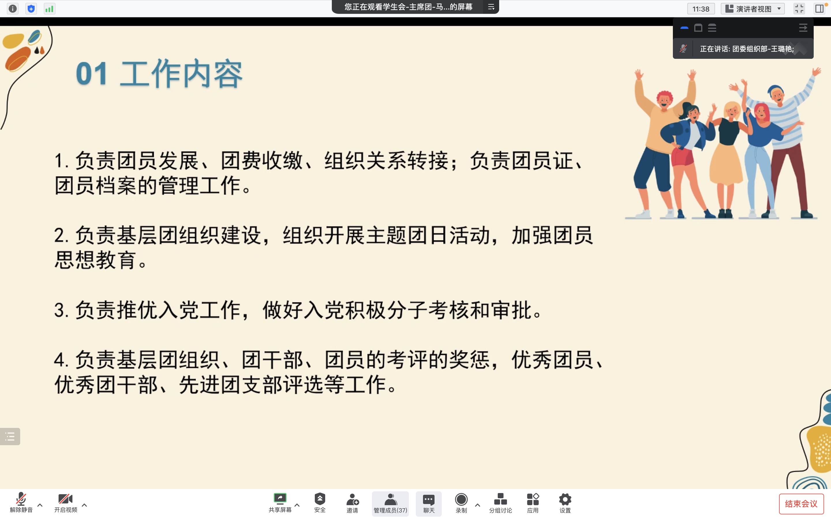 团委职能部门的负责同学王璐艳与党磊吉首先为同学们介绍了团委组织部与宣传部的定位、架构等,并为大家展示了部门基本工作职能与要求,团委职能部门是学院团委的主要执行机构,是沟通学院团委与各支部的纽带,两位负责人邀请各位同学积极加入,为学院团委部门奉献青春力量。