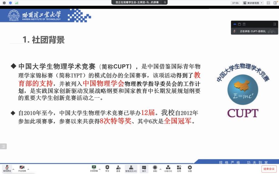 最后,大学生物理学术竞赛社的骨干成员岳琮沅为大家介绍了有关CUPT竞赛及社团的相关事宜,为大家展示了永利集团304一代代本科生在学术竞赛方面的光荣历史及优良传承。CUPT社团是学院科创竞赛方面的核心队伍,承担了学院本科生参加学术竞赛各方面的服务工作。