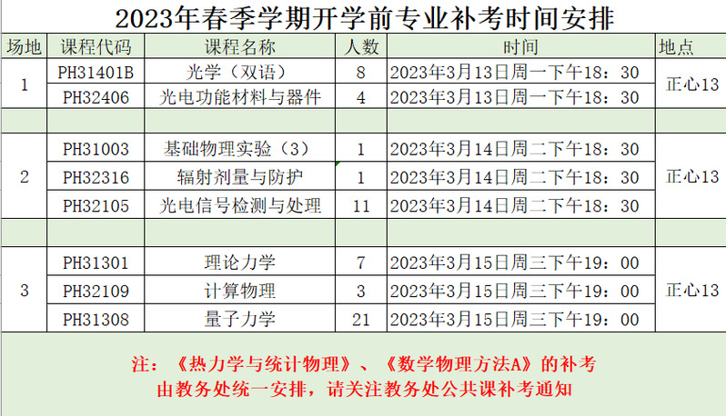 2023年春季学期本科开学前专业课补考时间安排