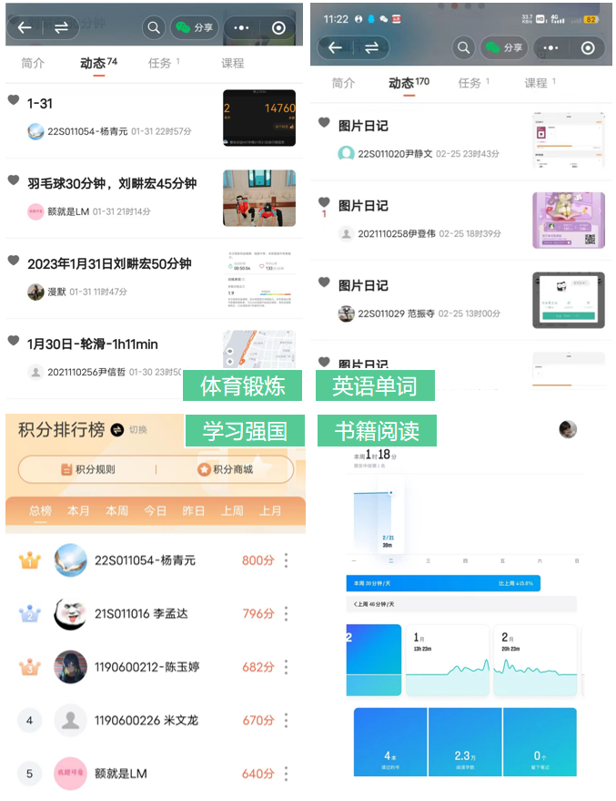 寒假自律打卡”系列活动共有“学习强国”、“书籍阅读”、“英语单词”、“体育锻炼”四个板块。系列活动从2023年1月15日开始,到2023年2月15日结束。活动参与者每日在学习强国APP中学习10分以上、阅读文学著作30分钟以上、学习或记忆英语单词100个以上、体育锻炼10分钟或跑步2千米以上则可在对应打卡活动中打卡一次。本次系列活动依托“小打卡”微信小程序,结合微信群聊,帮助参与活动的同学们更好地交流学习心得,高效完成打卡。