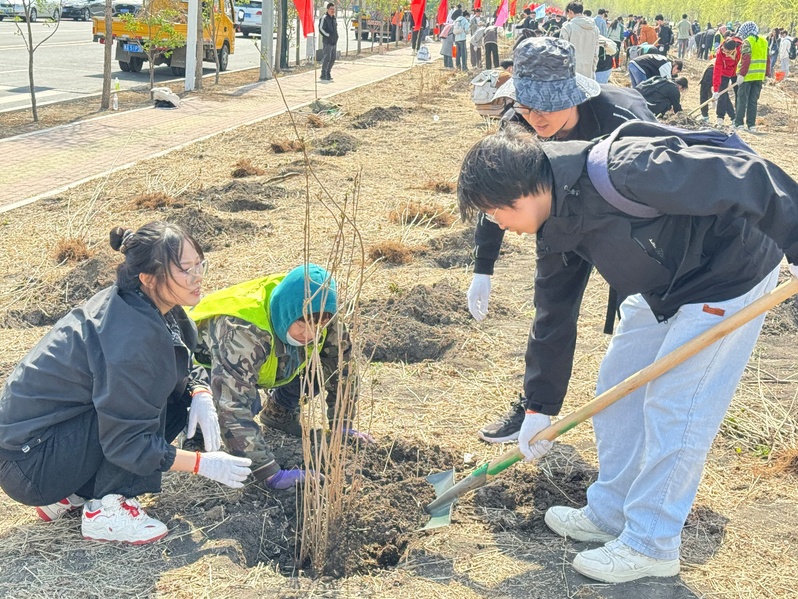 4月28日下午,志愿者们乘坐大巴车前往松北区冰峰路,开展集体植树活动。志愿者们在环卫工人的指导下分工协作,挥锹铲土、扶苗填坑、踩实修整,配合默契,植树活动忙碌而有序,新栽植的棵棵树苗迎风挺立,展现勃勃生机。