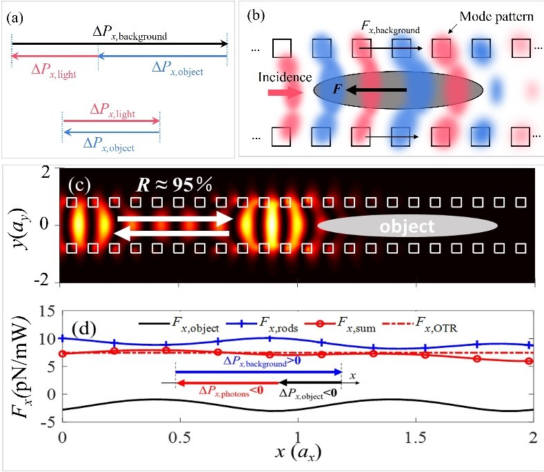 利用光力可以精准操控微纳物体,基于此发展起来的光镊技术获得了2018年诺贝尔物理学奖。但是传统光学操控仅能够实现对物体的定点捕获,而对物体的平动自由度操控效率很低,其中最大挑战之一是如何实现“逆光而上”的光学牵引。针对这一挑战,目前研究人员通常是利用调控光场与物体二者之间的动量传递来实现,这种机制对物体和光源有严苛的要求,限制了光学牵引力的产生和幅值的增加。针对这一现状,丁卫强教授团队突破现有研究思路和研究方案的制约,提出利用背景结构动量辅助实现高效光学牵引力的新方法,将传统方案中物体和光场二者之间的动量传递,推广到了物体、光场和背景结构三者之间。通过周期背景结构中连续域中束缚态这一特殊光学模式,将周期背景晶格的动量通过光场模式对称性调控传递给物体,实现了极高效率的光学牵引力,即使在光场被全反射的情况下依然能够实现光学牵引,该机制实现的光力比已有结果增强了近一个数量级,而且对物体参数变化不敏感。该研究成果为光力研究提供了新的思路,对发展先进光操控技术具有重要价值。