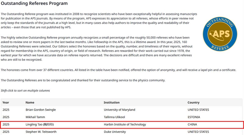 近日,美国物理学会公布了2025年度杰出审稿人(APS Outstanding Referees)名单。我院陶玲玲教授获此殊荣,也是哈工大首位获此奖项的教师。