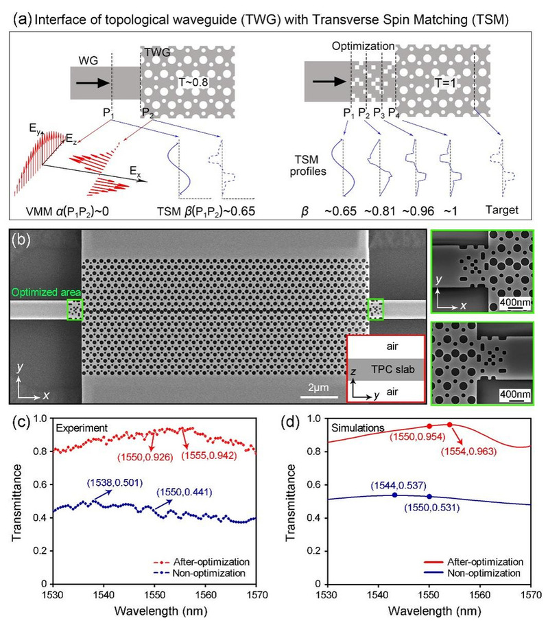 拓扑光子波导因鲁棒传输特性备受关注,但其与片上功能器件的低输入/输出耦合效率制约实际应用。传统模式匹配方法依赖电场模式的严格对准,但针对拓扑波导时效率较低。丁卫强教授团队通过理论计算与实验验证,首次揭示了横向自旋匹配(TSM)是拓扑波导高效耦合的关键机制。研究发现,横向自旋与能量流传播方向通过自旋−动量相互作用而锁定,通过调控横向自旋分布可实现能量单向传输。基于此,团队利用遗传算法设计出尺寸仅1.2×0.8 微平方米的超高效率耦合器,理论传输效率96.3%,实验测量也高达94.2%,较此前报道结果提升显著。研究表明横向自旋匹配(TSM)机制具有普适性,可扩展至其他拓扑结构,且耦合效率可通过进一步的深度优化继续提升(数值模拟结果显示效率能够超过99%)。该成果为拓扑光子芯片的大规模功能集成奠定了理论基础。